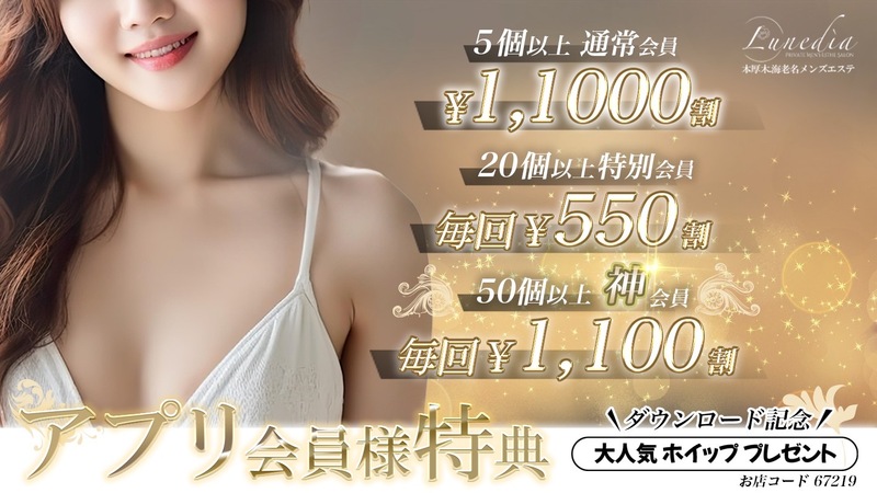 INFORMATION(お知らせ) ARRIVAL(新着情報) ⚜️ご予約空き状況⚜️ 【2/12(木)】 🤍ご案内可能🤍 TODAY'S(本日の出勤) 月島むぎ(27歳) 10:00~17:00 本厚木 小坂しおり(21歳) 12:00~18:00 本厚木 佐伯みあ(20歳) 12:00~18:00 本厚木 星野あずさ(20歳) 20:30~04:00 本厚木 事前予約割引(18歳) お問い合わせ 今週のスケジュール >> TWITTER(ツイッター) lunedia_salon1さんのポスト(ツイート)を見る NEWS&BLOG(ニュース&ブログ) NEWS 2026/1/26(月) 0:00 ⚜️セラピストさん急募⚜️ NEWS 2025/2/8(土) 0:00 ⚜️【電気毛布】全ルーム導入⚜️ もっとみる >> NEWS 2025/1/9(木) 0:00 ⚜️【2/28迄延長】RoyalSet135分¥29,700⚜️ NEWS 2024/7/18(木) 0:00 ⚜️お客様用アメニティ追加⚜️ もっとみる >> NEWS 2024/5/28(火) 0:00 ⚜️第三回無料招待抽選会⚜️ NEWS 2024/4/26(金) 0:00 ⚜️待望の復活【RoyalSet 135分】⚜️ もっとみる >> NEWS 2024/4/4(木) 0:00 ⚜️【1位】メンズエステランキング⚜️ NEWS 2024/3/8(金) 0:00 ⚜️只今求人大募集中⚜️ もっとみる >> NEWS 2023/9/28(木) 0:00 ⚜️10月から営業時間変更します⚜️ NEWS 2023/9/21(木) 0:00 ⚜️自慢のルーム紹介⚜️ もっとみる >> NEWS 2023/7/1(土) 0:00 ⚜️第二回施術無料抽選会開催⚜️ NEWS 2023/4/27(木) 0:00 ⚜️新Sexy衣装START⚜️ もっとみる >> NEWS 2023/1/11(水) 0:00 ⚜️紙パンツ2種類完備しました⚜️ NEWS 2023/1/10(火) 0:00 ⚜️カウンセリングシート⚜️ もっとみる >> NEWS 2023/1/6(金) 0:00 ⚜️ヒーター完備しました⚜️ NEWS 2023/1/3(火) 0:00 ⚜️料金についてお知らせ⚜️ もっとみる >> NEWS 2022/12/23(金) 0:00 ⚜️年末年始営業⚜️ NEWS 2022/12/3(土) 0:00 ⚜️【アプリ】12月限定クーポン配信中⚜️ もっとみる >> NEWS 2022/12/2(金) 0:00 🎄Christmas event開催🎄 NEWS 2022/7/27(水) 0:00 ⚜️第一回施術プレゼント抽選会開催⚜️ もっとみる >> NEWS 2022/7/21(木) 0:00 ⚜️セラピストさん大募集中⚜️ NEWS 2022/7/21(木) 0:00 ⚜️アプリ予約&WEB予約⚜️ もっとみる >> NEWS 2022/4/26(火) 0:00 ⚜️町田店5/17(火)OPEN⚜️ NEWS 2022/1/18(火) 0:00 ⚜️各種割引⚜️ もっとみる >> NEWS 2022/1/4(火) 0:00 ⚜️新年御挨拶⚜️ NEWS 2021/12/29(水) 0:00 ⚜️年末年始営業日⚜️ もっとみる >> NEWS 2021/12/13(月) 0:00 ⚜️本厚木2ルーム目Open⚜️ NEWS 2021/11/19(金) 0:00 ⚜️クリスマスイベント⚜️ もっとみる >> NEWS 2021/9/30(木) 0:00 ⚜️事前予約割引第二弾⚜️ NEWS 2021/9/15(水) 0:00 ⚜️高級マットレス⚜️ もっとみる >> NEWS 2021/8/31(火) 0:00 ⚜️事前予約オープン割引⚜️ NEWS 2021/8/25(水) 0:00 ⚜️新人割引⚜️ もっとみる >> NEWS 2021/8/17(火) 0:00 ⚜️アクセスについて⚜️